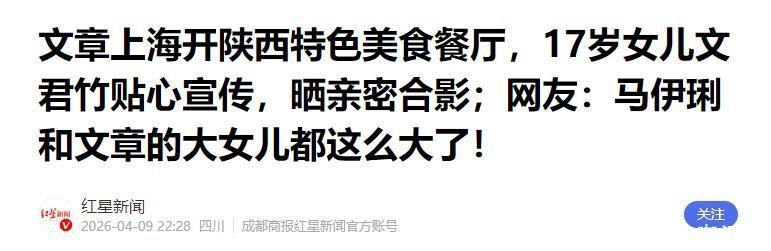参考资料:红星新闻《文章上海开陕西特色美食餐厅,17岁女儿文君竹贴心宣传,晒亲密合影;网友:马伊琍和文章的大女儿都这么大了!》